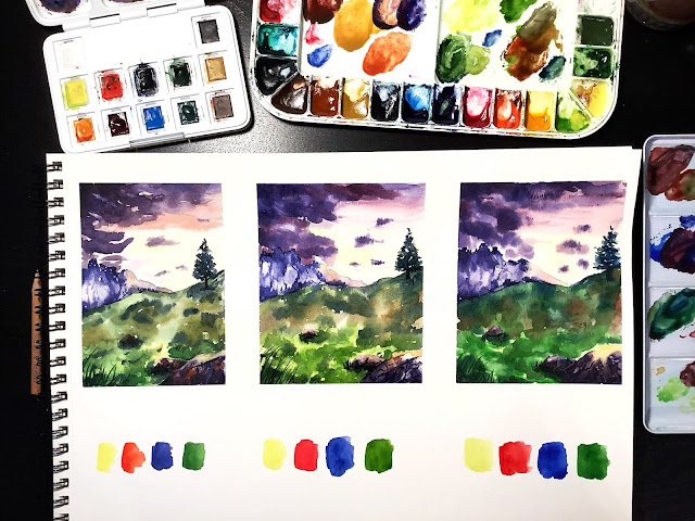 Ostatecznie do krajobrazów użyłam 4 kolory: zimny żółty, czerwony, ciepły niebieski i zielony. Tak ograniczona paleta, zmusza mnie do mieszania kolorów, a to przecież ważny czynnik w ocenie farb.